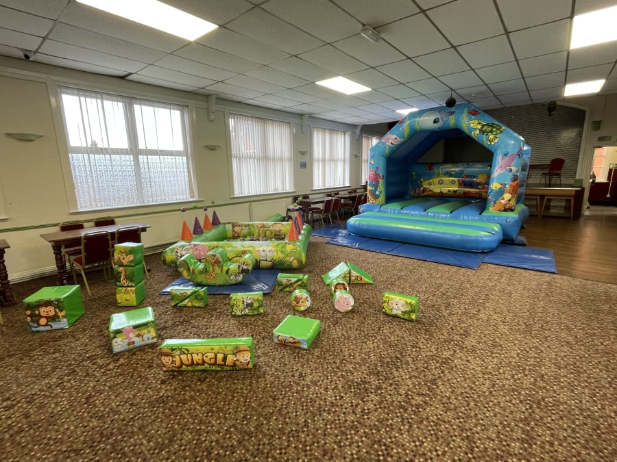 This Venue is a good size venue, It does not have onsite parking but does have street parking(Limited) We would advise no bigger than a 12x12ft castle due to the stairs and lighting in the venue, I believe it has a bar available also which is a bonus for the adults.